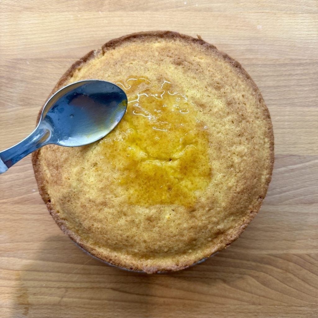 Retome o bolo já frio, coloque-o em um prato de servir e comece a regar a superfície do bolo com a calda usando uma colher.