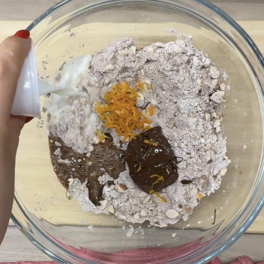 Junte a casca de meio limão ralado e de meia laranja ralada. Se você gosta da combinação de chocolate com laranja, pode também colocar a casca de uma laranja inteira. Adicione também o chocolate derretido.