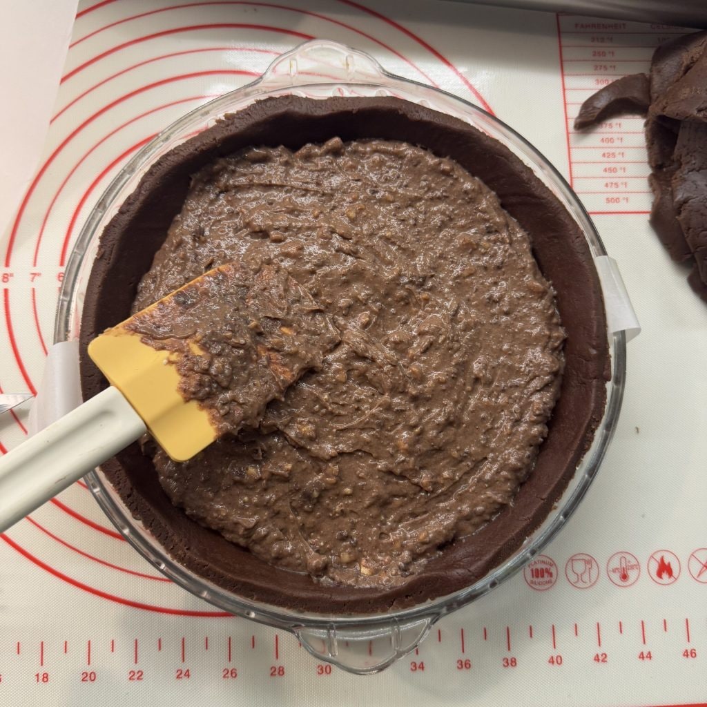 Com uma espátula, distribua o recheio dentro da torta e nivele a superfície.