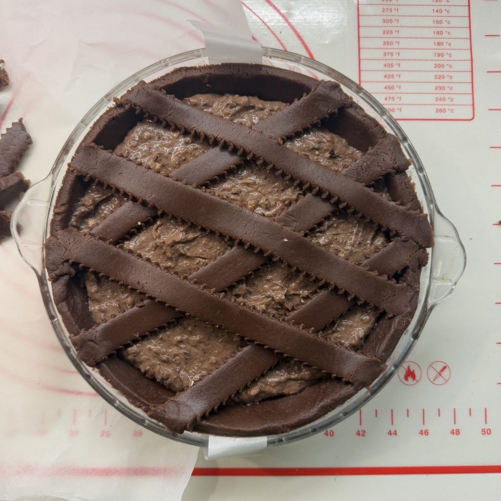 Preparei essa torta usando uma clássica massa de manteiga com cacau e para o recheio escolhi como ingredientes principais a ricota, o chocolate amargo derretido, um dos meus ingredientes favoritos em doces, ao qual adicionei também algumas colheres de creme de avelã para torná-la ainda mais convidativa.