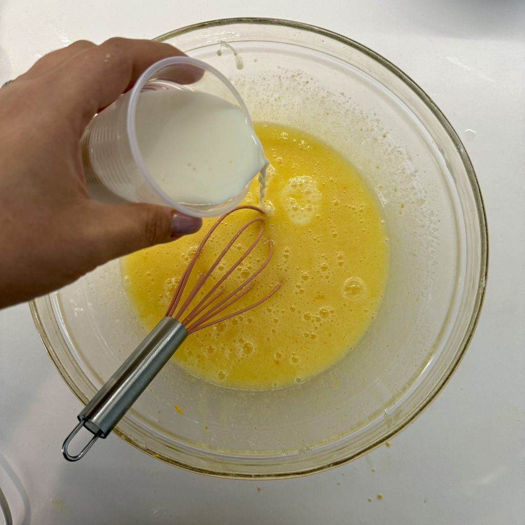 Depois, adicione o copo de leite ou suco e misture novamente.