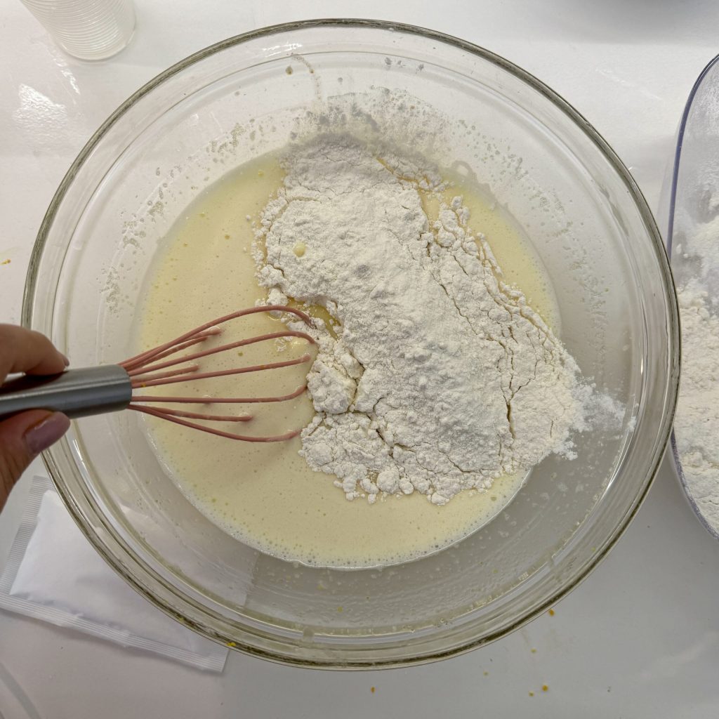 Feito isso, comece a incorporar os ingredientes secos. Adicione a farinha