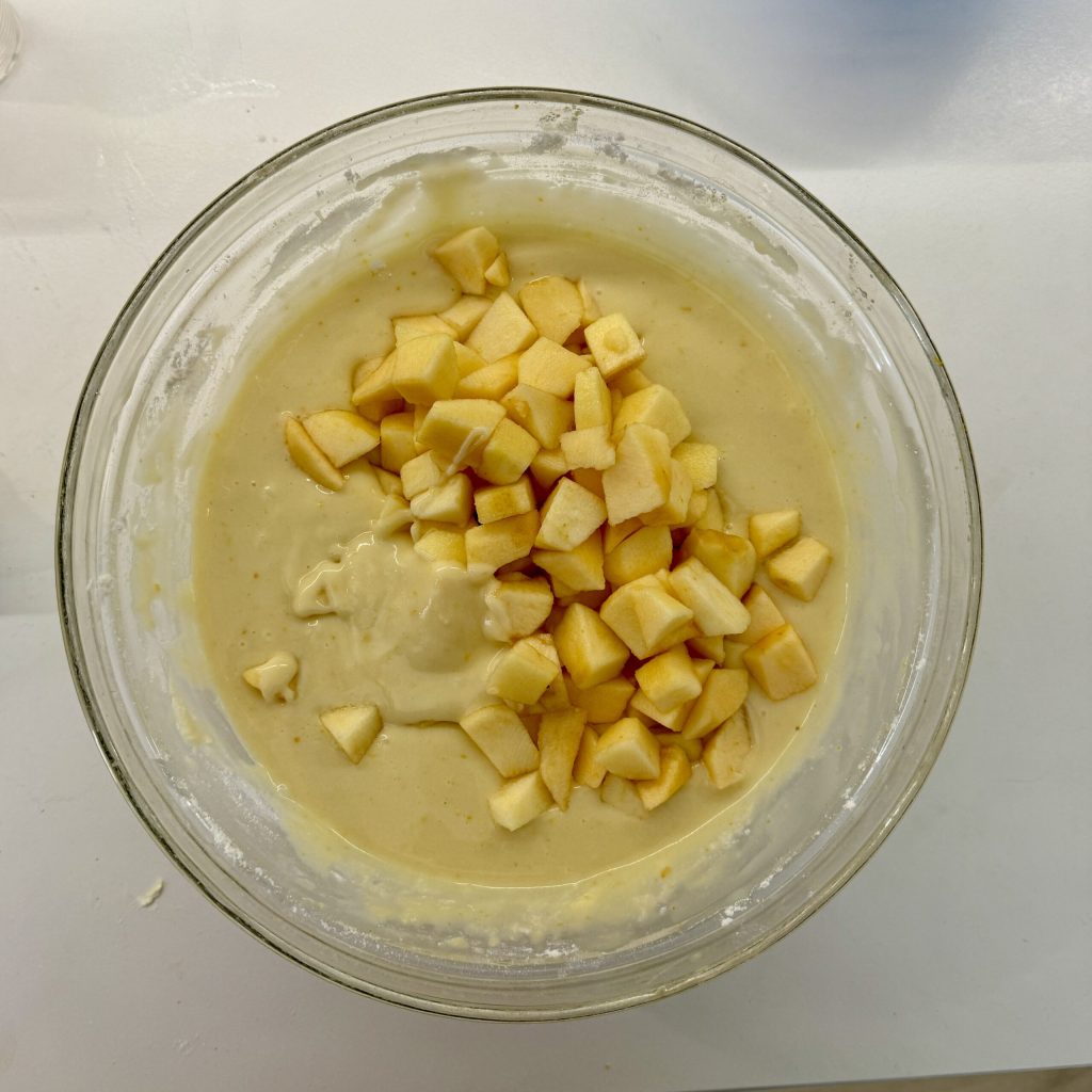 Adicione à massa os pedaços de maçã e misture para distribuí-los. Enfarinhe e unte uma forma de 24 cm de diâmetro com fundo removível.