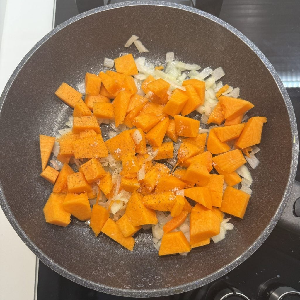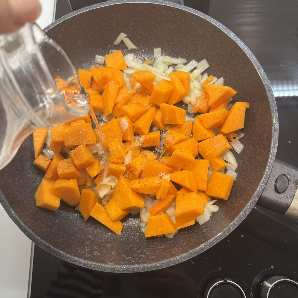Acenda o fogo, aqueça e depois adicione também os pedaços de abóbora. Tempere com sal e pimenta.