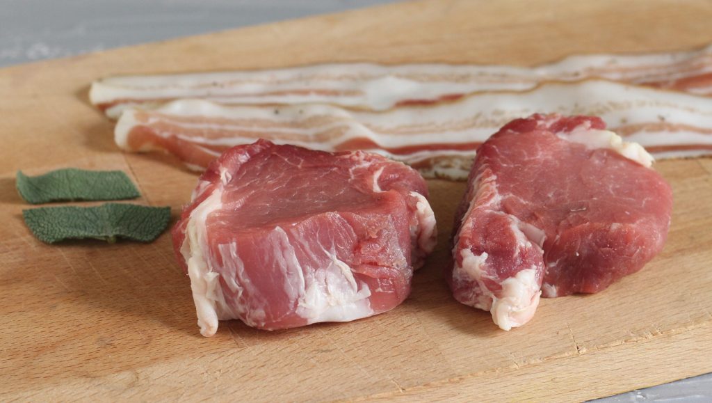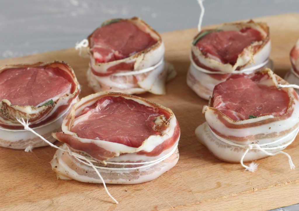 1. Coloque à sua frente o que precisa para fazer os medalhões: carne, bacon fatiado e as folhas de sálvia divididas ao meio.