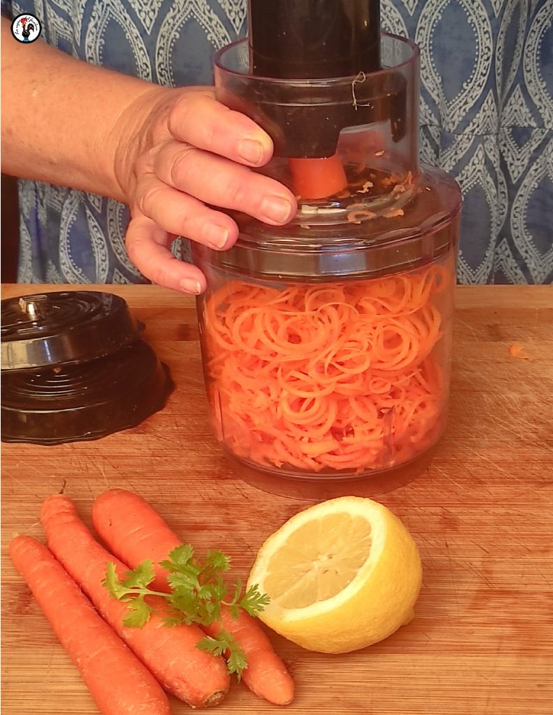 O espiralizador elétrico, por sua vez, tem seu próprio motor e trabalha sem nos cansar, como todos os eletrodomésticos. Eu tenho dois tipos diferentes de apontadores manuais, que uso se estou preparando espaguete apenas para mim. Mas meu mixer de mão tem um acessório espiralizador que uso muito e recomendo. Recomendo, no entanto, praticar sem desanimar se, nas primeiras tentativas, nossos espaguetes não forem perfeitos. É preciso ser preciso ao cortar as cenouras, sem fazer cortes oblíquos, aprender a dosar a pressão exercida e a velocidade do mixer e, finalmente, escolher cenouras grandes o suficiente. Com a prática, os resultados serão surpreendentes.