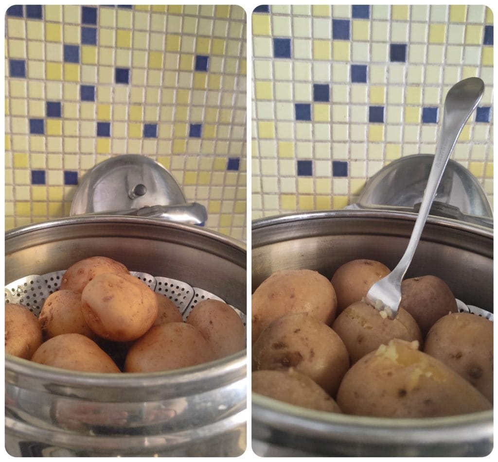 • Primeiro, lavamos bem as batatas e as colocamos inteiras na panela de pressão, com o cesto de aço, para que cozinhem a vapor. Deixe por 12 minutos após o apito, abaixando o fogo, depois libere a pressão da panela e abra a tampa. Deixe as batatas esfriarem brevemente.
