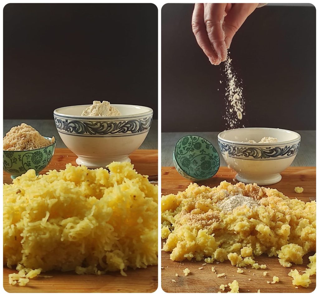 • Passamos as batatas pelo espremedor sem retirar a casca e formamos um monte na bancada. Esperamos que as batatas estejam quase completamente frias e que o vapor tenha saído completamente. Então, adicionamos uma pitada de sal, a farinha de avelãs e um terço da farinha de espelta. Misturamos com o garfo ou com as mãos e adicionamos outra parte da farinha, mas não toda.