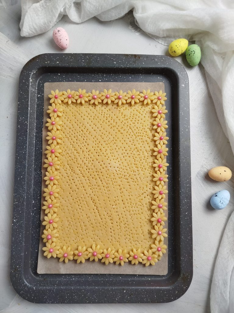 Com as sobras de massa, corte flores e forme uma borda ao longo do retângulo, sobrepondo levemente as flores e pressionando ligeiramente.