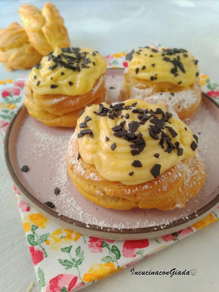 São rosquinhas macias de massa choux assadas ou fritas, recheadas com creme de confeiteiro e cobertas com cerejas em calda e uma polvilhada de açúcar de confeiteiro. No meu caso, como as cerejas não são muito apreciadas, eu as cobri com creme e lascas de chocolate amargo 😋.