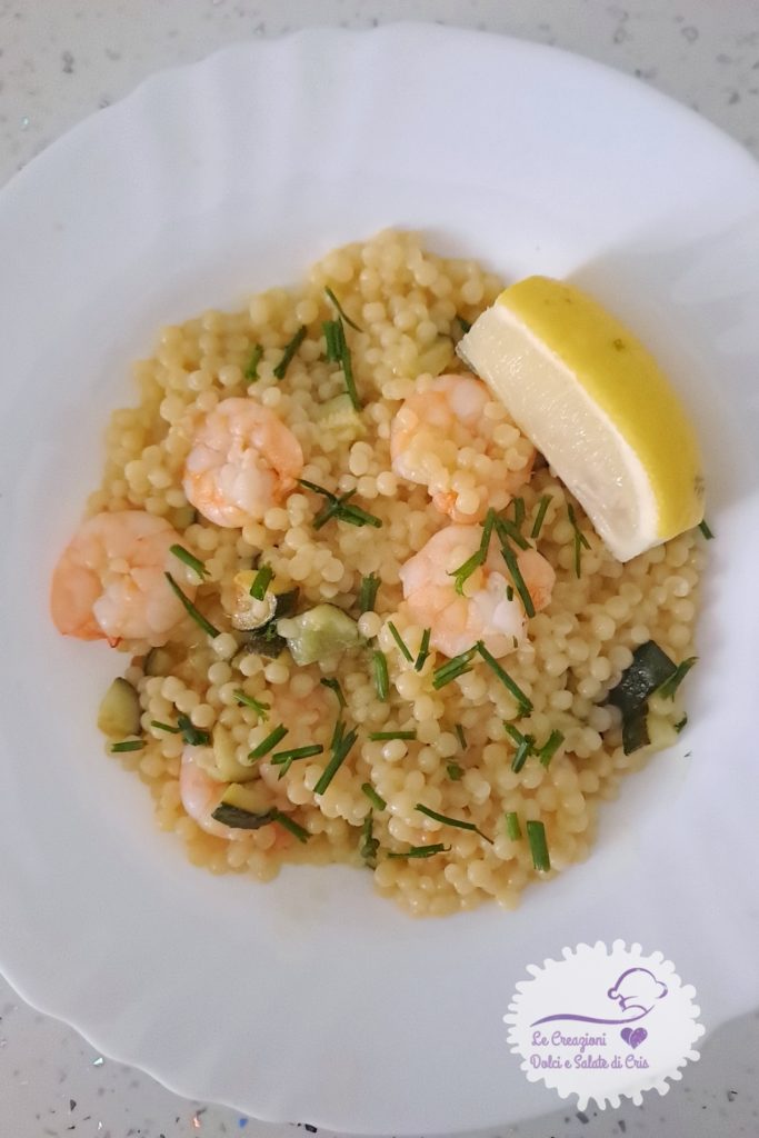 Cous Cous com camarões, um prato que tem sabor de mar mas que nos traz de volta à terra graças ao sabor das abobrinhas e às notas cítricas do limão. Para preparar este prato usei o cous cous perolado que tem o grão ligeiramente maior, você o encontra facilmente nos supermercados, eu comprei no Coop.