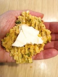 Em seguida, comece a formar as almôndegas. Pegue uma pequena parte da mistura, achate-a na palma da mão, insira um pedaço de provolone e feche a almôndega ajudando-se com as mãos.