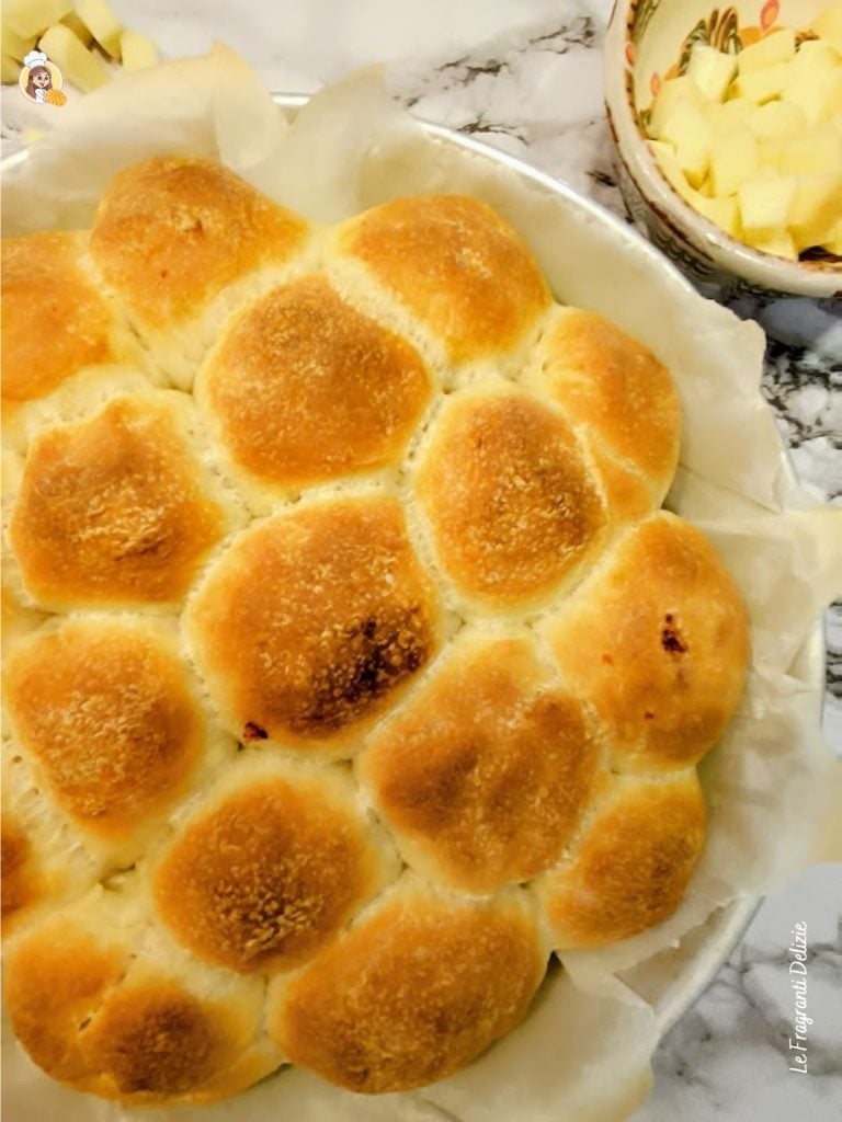 Uma vez fermentada a massa, amasse-a novamente e divida em bolinhas de cerca de 50 g cada. Achate uma bolinha de cada vez com as mãos e coloque um pouco de provolone e salame no centro. Feche bem cada bolinha, formando esferas lisas, rolando a massa na superfície de trabalho. Em seguida, disponha as bolinhas recheadas em uma assadeira redonda de 26-28 cm de diâmetro, forrada com papel manteiga levemente untado, deixando um pouco de espaço entre elas. Cubra a assadeira com um pano e deixe fermentar novamente por cerca de 1 hora, ou até dobrar de tamanho.