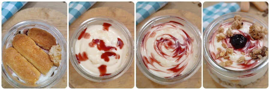 Continue cobrindo com mais biscoitos champanhe cortados e outra camada de creme. Adicione o xarope de amarena, e com um palito faça um desenho em círculo. Finalize com amarenas e alguns pedaços de granola de avelã e chocolate.