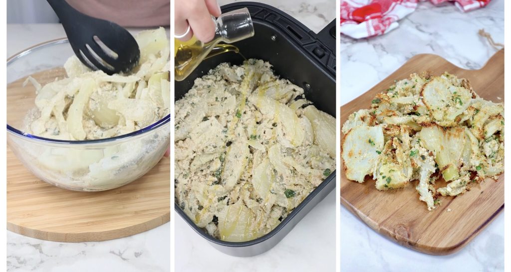 • Escorremos o funcho e secamos bem. Misturamos com os outros ingredientes e transferimos tudo diretamente para o cesto da fritadeira sem óleo. Regamos com um fio de azeite evo e deixamos cozinhar a 190 graus por cerca de 10-15 minutos, virando na metade do tempo.