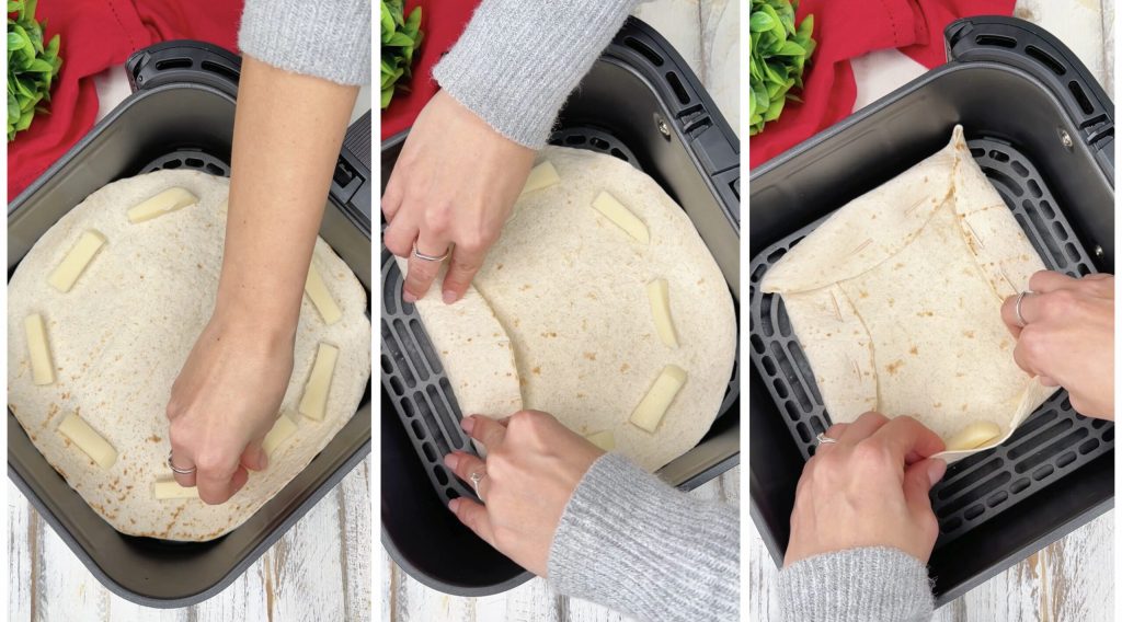 Colocamos os palitos de provolone ao longo das bordas da piadina, formando um quadrado. Dobramos os quatro lados para dentro, cobrindo bem o queijo, e fixamos cada canto com um palito. Assim, criaremos uma borda saborosa que ficará derretida na cocção!