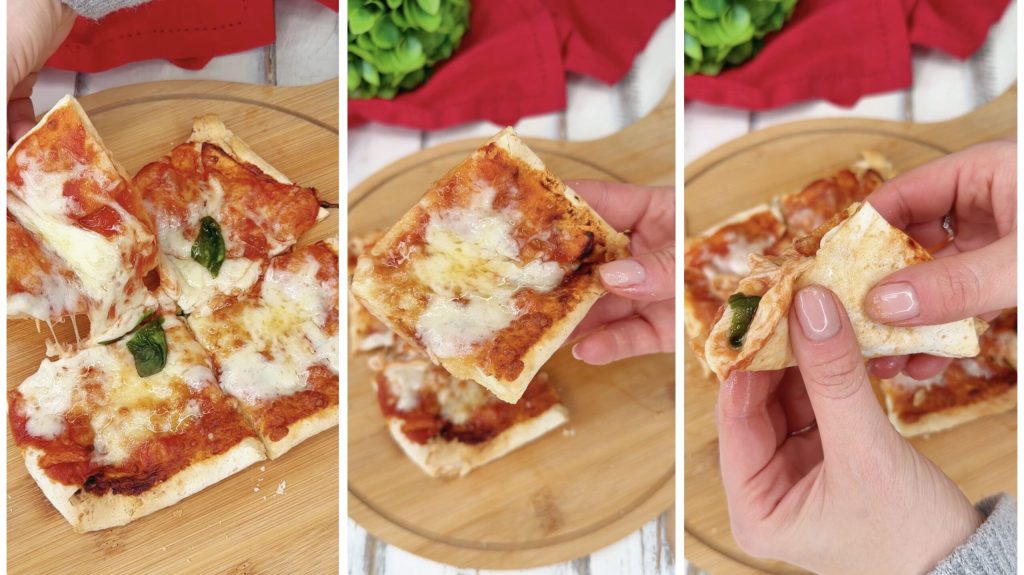 O truque dos palitos: Para evitar que a borda se abra durante a cocção, certifique-se de inserir os palitos pegando bem ambas as pontas da piadina. Se usar a fritadeira sem óleo, certifique-se de que os palitos não toquem a resistência superior.