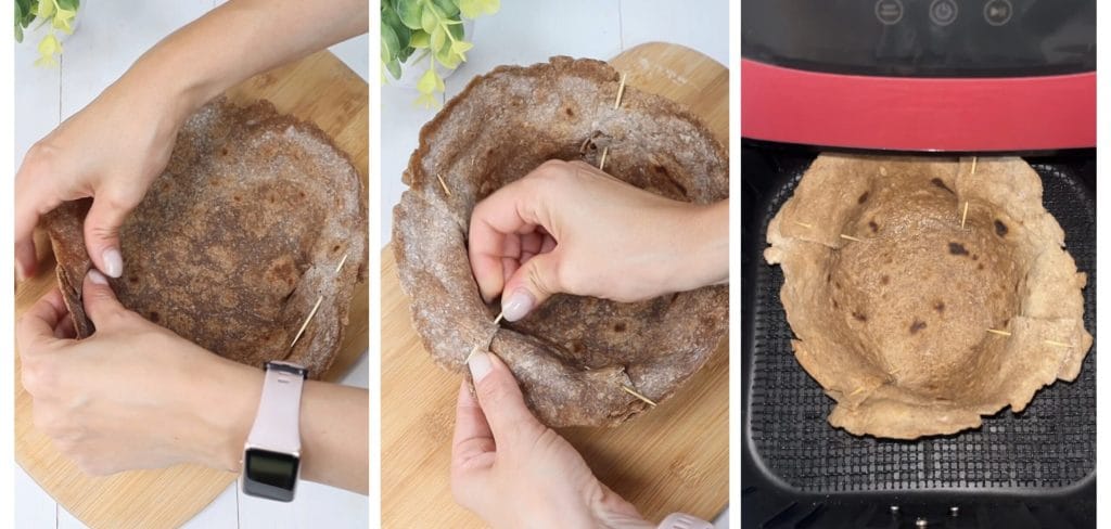 • Criamos os cestos de pão sírio: basta prender as laterais do pão dobrando-as e colocando palitos para segurá-las. Colocamos cerca de 4 ou mais, se necessário. Transferimos o cesto de pão para a fritadeira elétrica e cozinhamos a 190 graus por cerca de 3-4 minutos. Quando os cestos estiverem prontos, podemos remover os palitos.