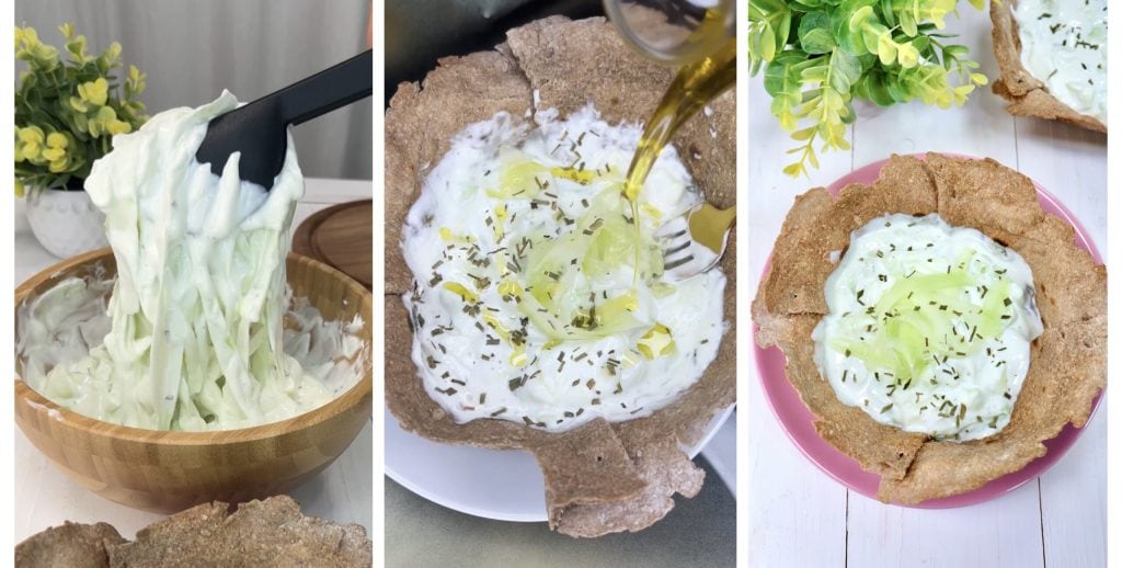 O pão sírio é muito fácil de fazer, usaremos apenas farinha integral (ou se preferir, a 00), água e sal. Você também pode optar por usar pães já prontos. Em seguida, vamos criar de maneira super simples os cestos de pão sírio que vamos cozinhar por poucos minutos na fritadeira elétrica, desse modo serviremos a salada tzatziki de uma forma original, sem prato, e podemos comer o pão crocante junto com a salada ou no final. Esta receita é muito simples de fazer e requer poucos passos.