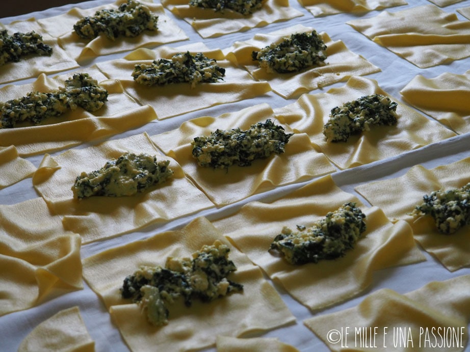 Estenda a massa com o rolo ou a máquina de massa até uma espessura fina e corte em retângulos de cerca de 12 cm.