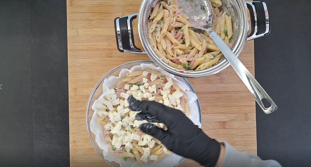 Escorra-as e passe imediatamente em água fria ou reserve para juntá-las ao macarrão de forno.Cozinhe o macarrão em bastante água salgada e escorra al dente. Deixe-o diretamente na panela: assim você evita sujar outras tigelas e pode misturar tudo confortavelmente.