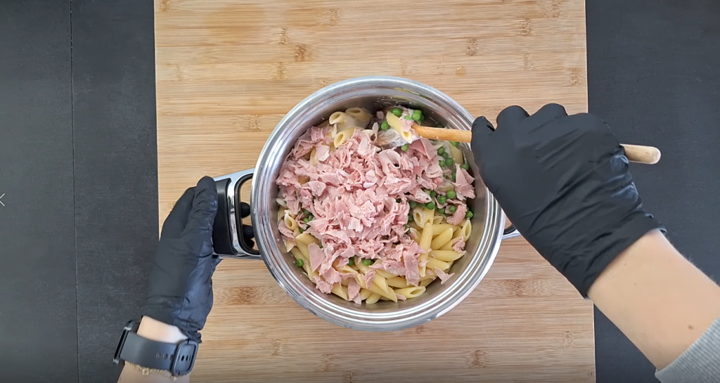 Despeje na panela quase todo o molho branco, reservando um pouco para a superfície. Adicione presunto e ervilhas e misture delicadamente até obter um macarrão bem envolto pelo creme.