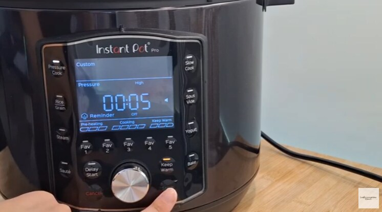 Pressione Start. A panela levará alguns minutos para pressurizar, então o cronômetro começará a contagem regressiva de 5 minutos.