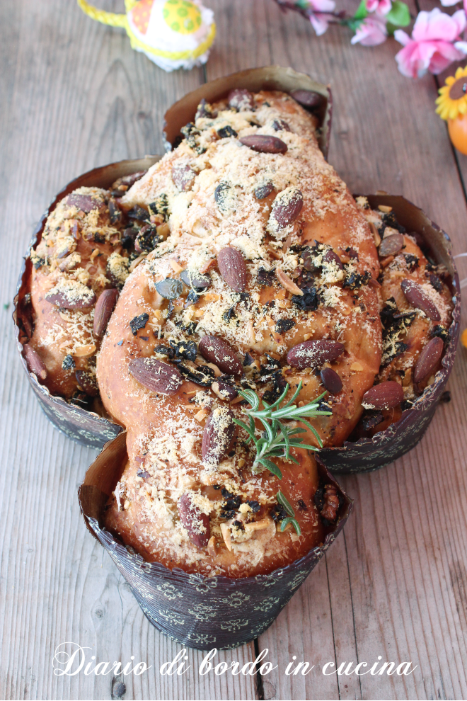 Colomba salgada com tomates secos, queijos, azeitonas e mortadela