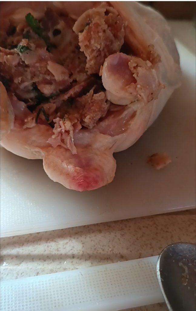 Recheie o frango limpo e lavado previamente com este recheio, depois costure ou feche a abertura com palitos.
