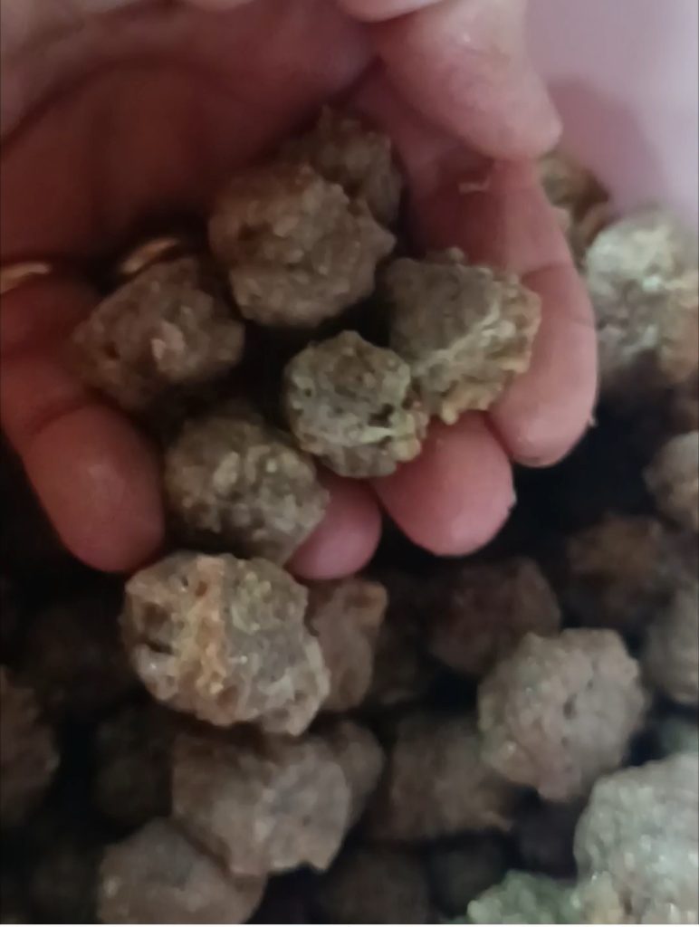 Depois de misturar tudo, com as mãos molhadas faça bolinhas do tamanho de uma avelã. Aqueça em fogo médio a frigideira com o óleo para fritura e coloque as almôndegas. Quando estiverem bem douradas, com uma escumadeira retire-as e coloque sobre papel absorvente.