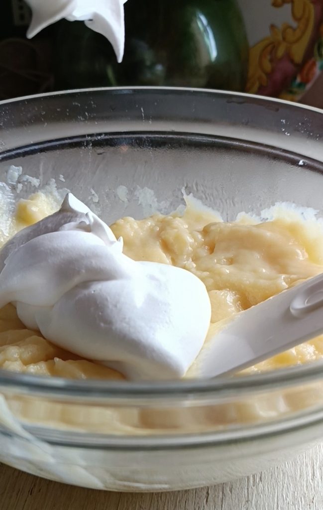 Adicione as claras às gemas, cuidadosamente com movimentos de baixo para cima. Acrescente a farinha, o fermento, a casca ralada de limão e a baunilha. Você deve obter uma mistura macia e espumosa.