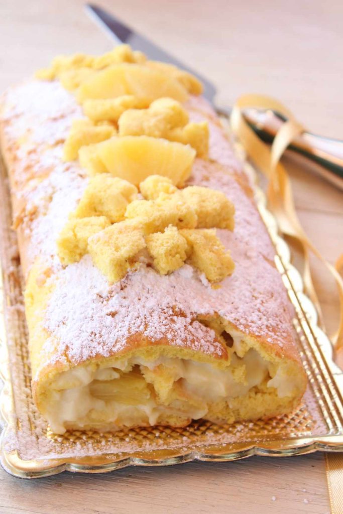 Transfira o rocambole para uma bandeja, polvilhe com açúcar de confeiteiro e decore com os pedaços de massa de biscoito e abacaxi.