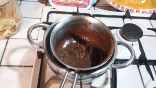 • Derreta em banho-maria e separadamente 75 g de chocolate branco e chocolate amargo.