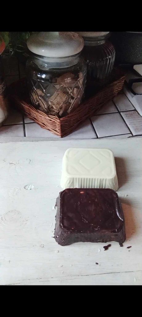• Revista com chocolate branco e chocolate amargo as duas formas de porção única e coloque-as para secar na geladeira.