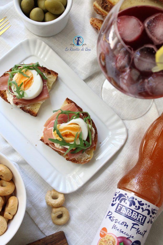 Espero vocês todos os dias no grupo e na fan page do Facebook de Le Ricette di Bea com a Receita do Dia, um encontro imperdível para começar o dia com um mimo doce ou salgado! Aqui embaixo você encontra a vídeo receita para preparar os crostini com presunto cru, ovos cozidos e ricota e o coquetel com maracujá e suco de mirtilo para acompanhar este aperitivo, drink não alcoólico perfeito para o verão! Vamos agora à receita!