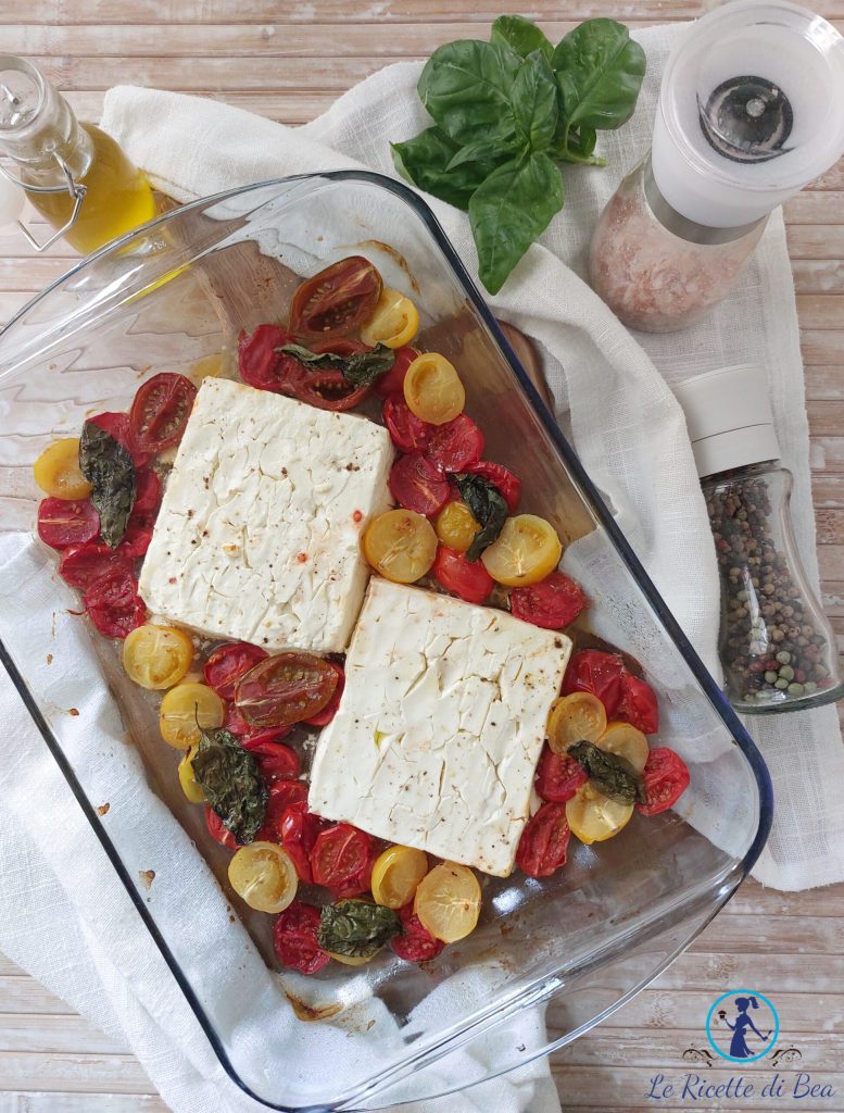 Este é um prato que você pode servir quente ou frio. Perfeito como aperitivo ou para um happy hour cortando a feta em cubos antes de servir aos seus convidados. Colorido, de verão, rico em sabor e com o aroma intenso de manjericão. Sua cozinha vai cheirar por horas.