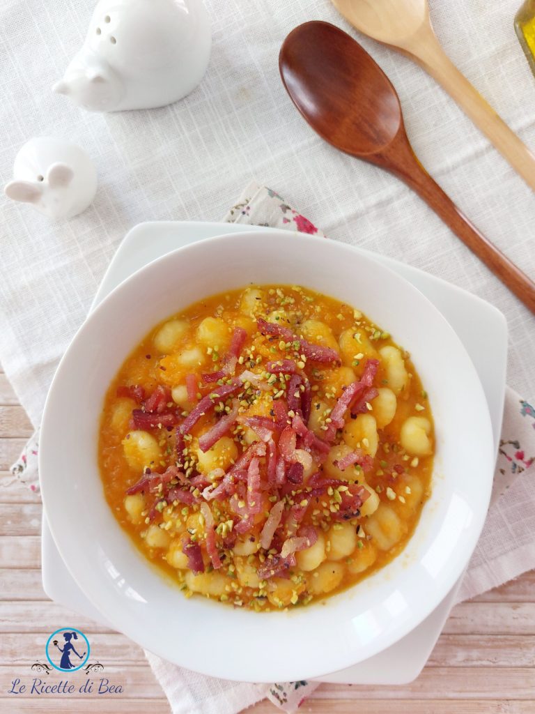 Com a abóbora pronta, podemos triturá-la com um mixer ou um liquidificador de imersão, o que for mais prático para você. Adicione três ou quatro conchas generosas de água do cozimento para tornar bastante fluido o creme de abóbora. Adicionei algumas tiras de Speck IGP enquanto triturava para deixar o creme de abóbora ainda mais saboroso. Neste ponto, faltam apenas os nhoques, obviamente rapidíssimos de cozinhar. Tempo de colocá-los na água e já é hora de tirá-los.