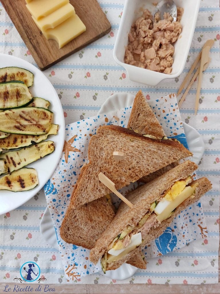 Agora pegue uma fatia de pão torrado, coloque-a no prato e espalhe uma generosa porção de maionese. Coloque então as abobrinhas grelhadas, depois o queijo, depois o atum ajudando-se com uma colher ou com as mãos, as fatias de ovos cozidos e feche com a segunda fatia de pão torrado espalhada com maionese.