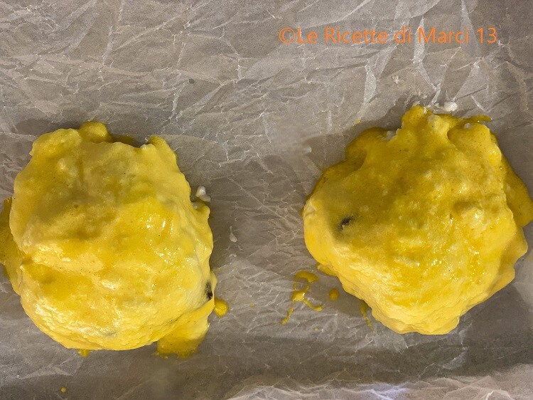 Pegue uma forma de forno, cubra-a com papel manteiga e pincele dois círculos distantes com as gemas batidas anteriormente (v.foto abaixo).