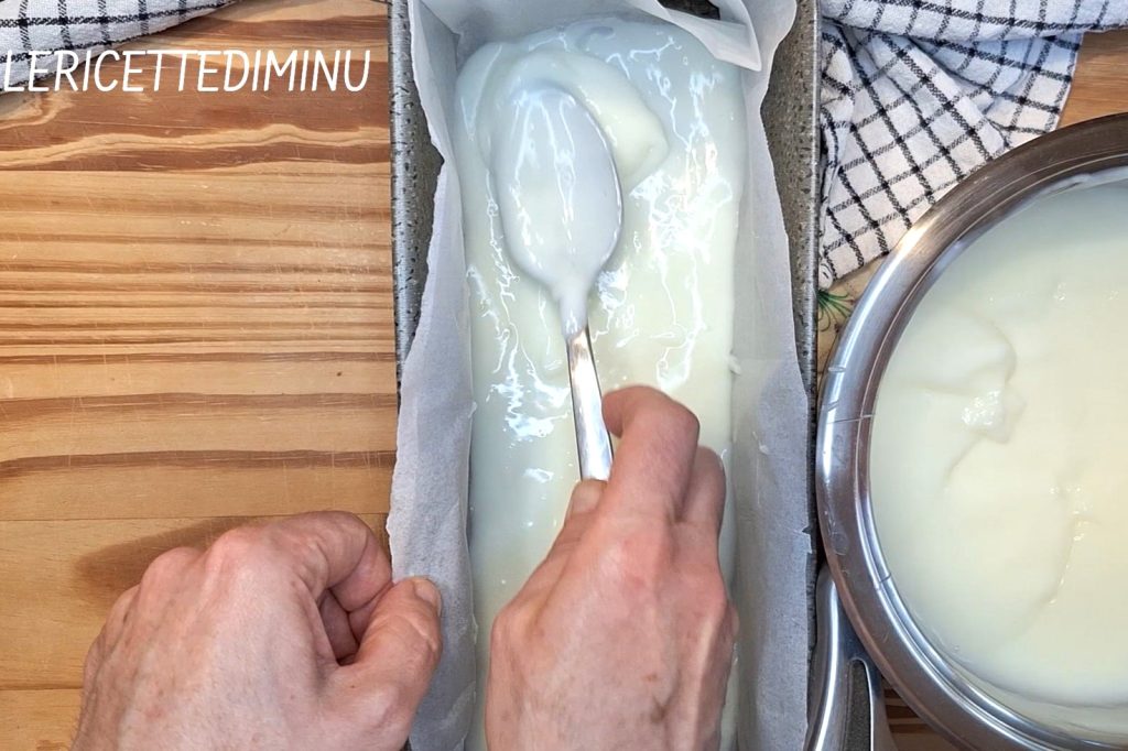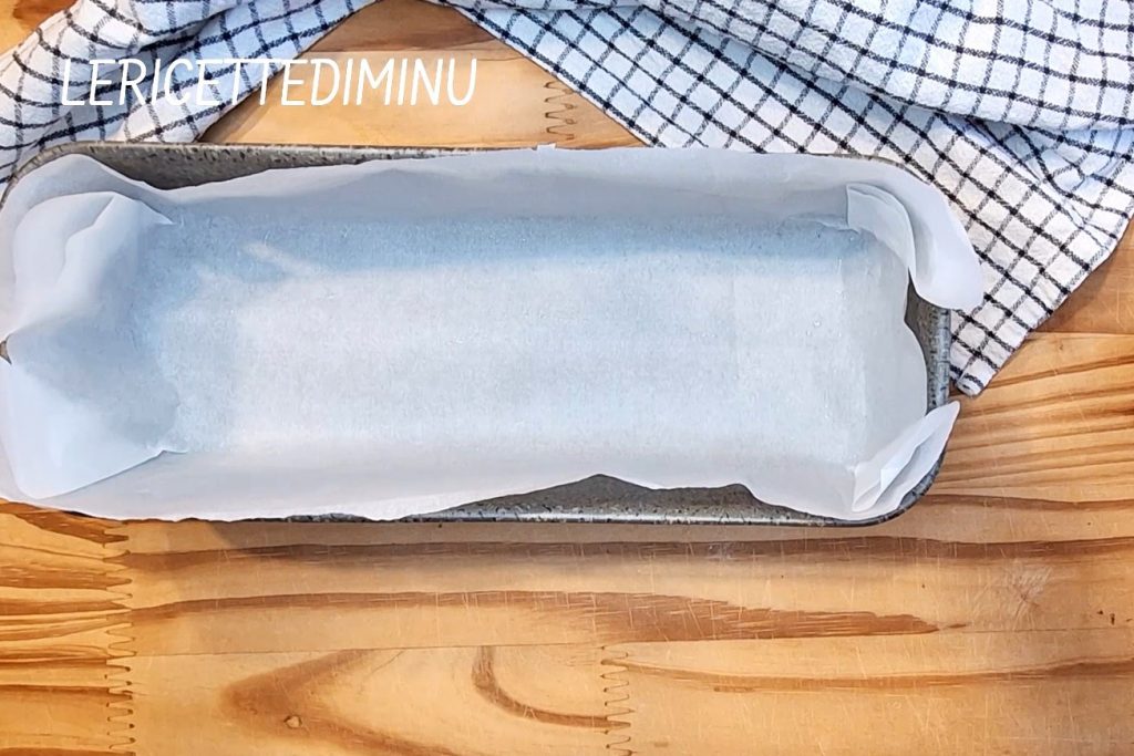 Forre uma forma de plumcake com papel manteiga cortado no tamanho, depois molhado e espremido.Isso fará com que ela adira melhor às paredes da forma evitando que se desloque quando formos despejar o creme.