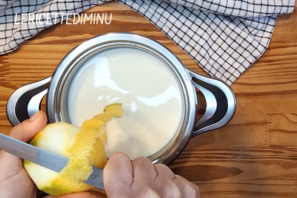 Adicione a casca de um limão não tratado, cortada em tiras, e leve ao fogo médio, mexendo sempre até a ebulição.