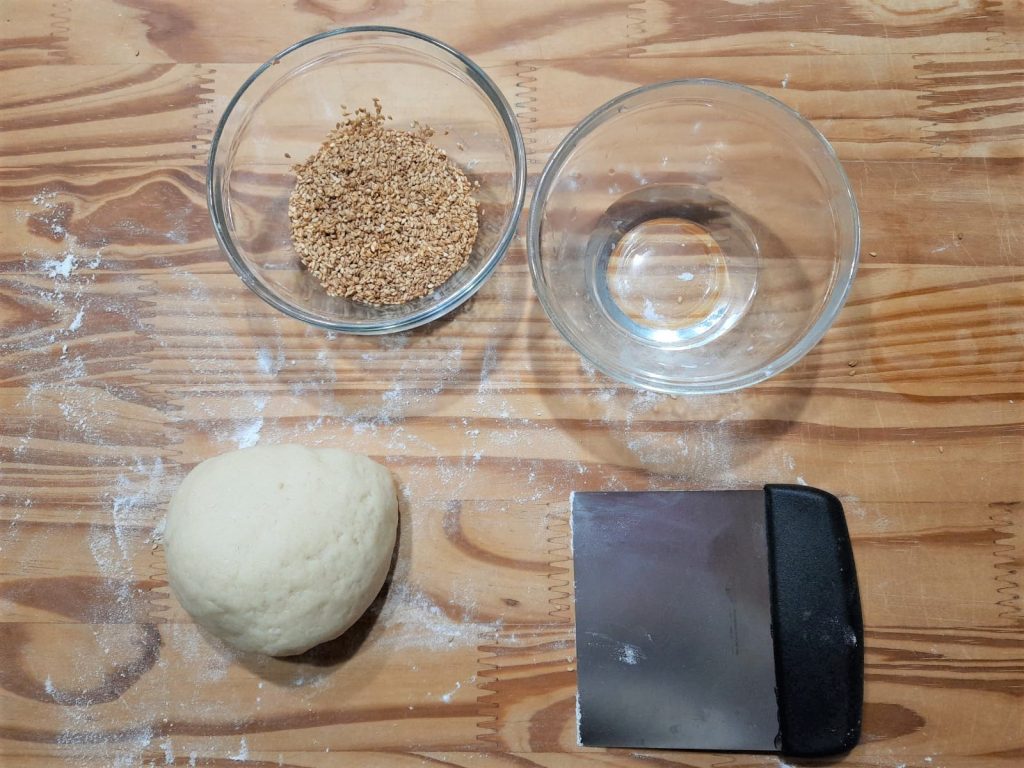 Para manter a água limpa até o final dessa operação, é útil usar a mesma mão tanto para mergulhar os pedaços de massa na água quanto para mergulhá-los no gergelim.