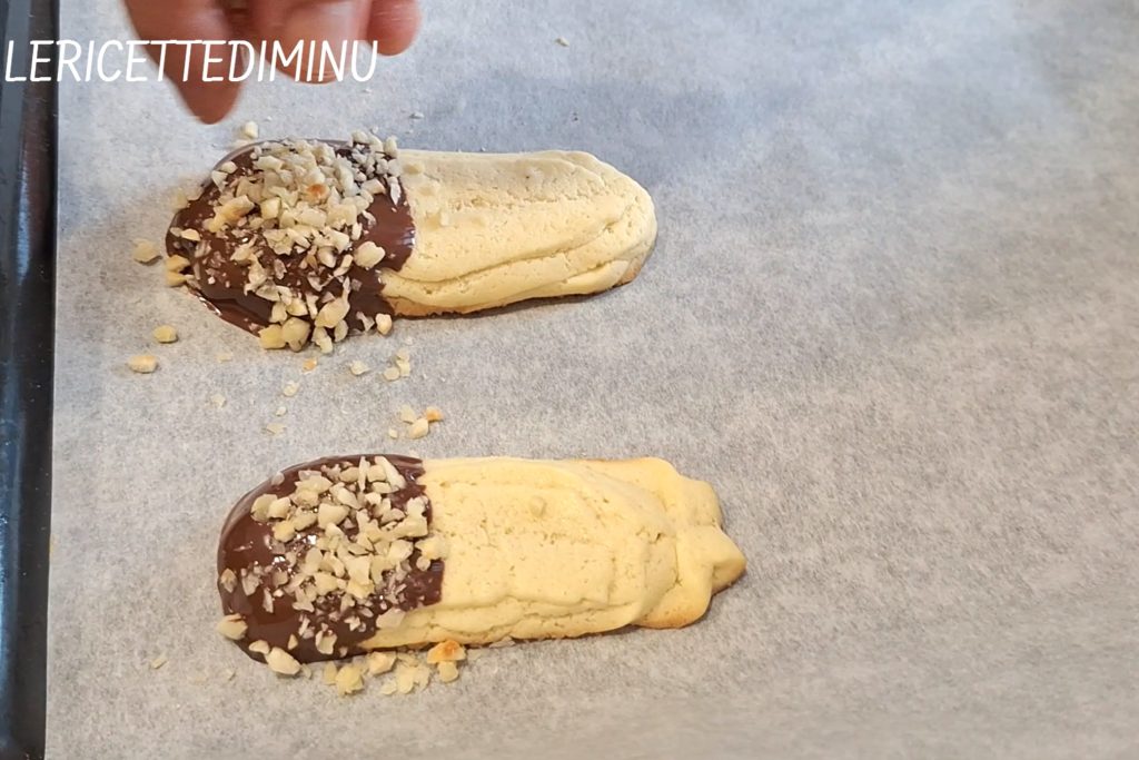 Uma vez em temperatura ambiente, derreta o chocolate amargo em banho-maria e com ele decore os biscoitos, colocando-os em uma bandeja forrada com papel manteiga.A gosto, adicione granulado de amêndoas torradas, ou de pistache ou de avelãs.