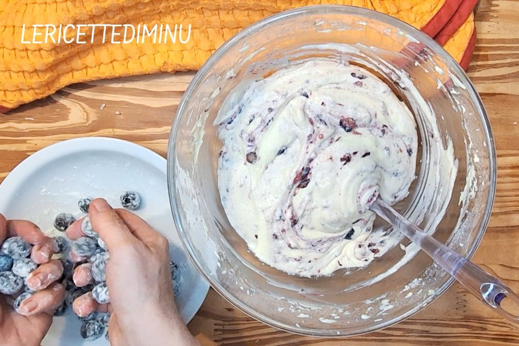 • Adicionar então os mirtilos batidos e mexer com uma espátula. Por último, os mirtilos inteiros, sacudindo-os antes para eliminar o excesso de farinha.