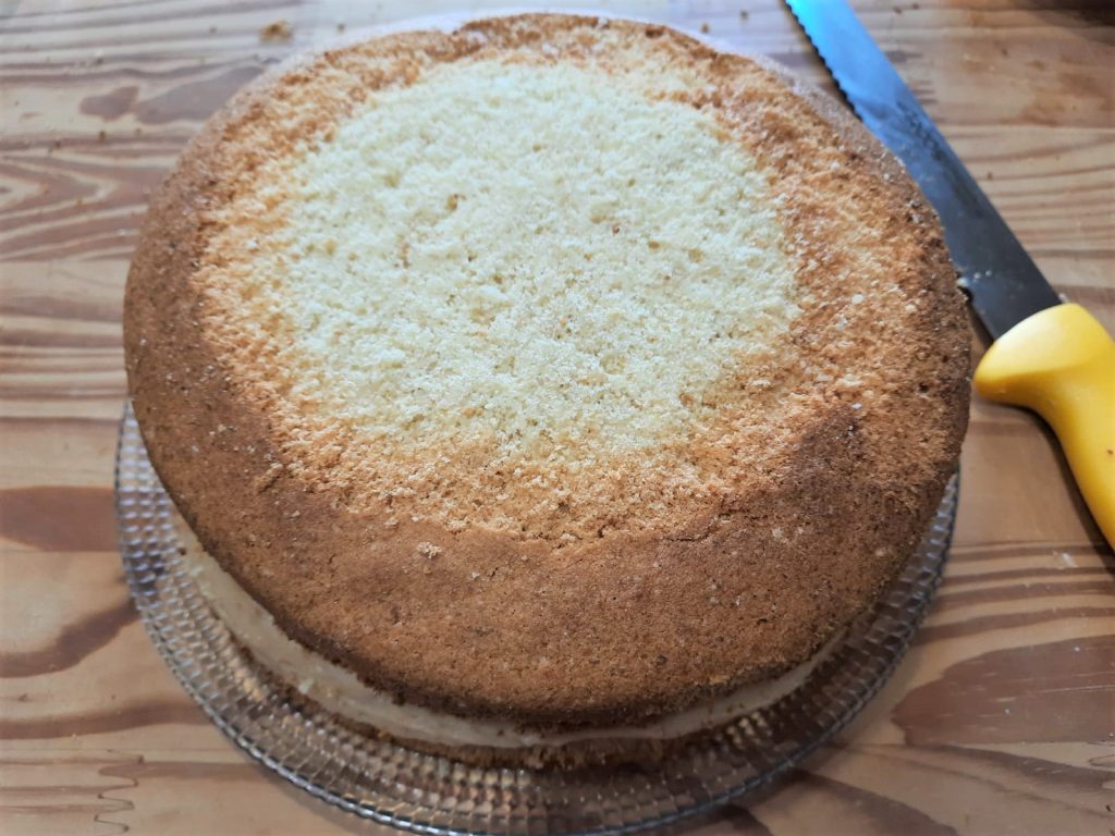 Pare a parte superior do bolo removendo a cúpula, corte o bolo ao meio com uma faca corta-bolo e molhe com água e açúcar de confeiteiro dissolvido.