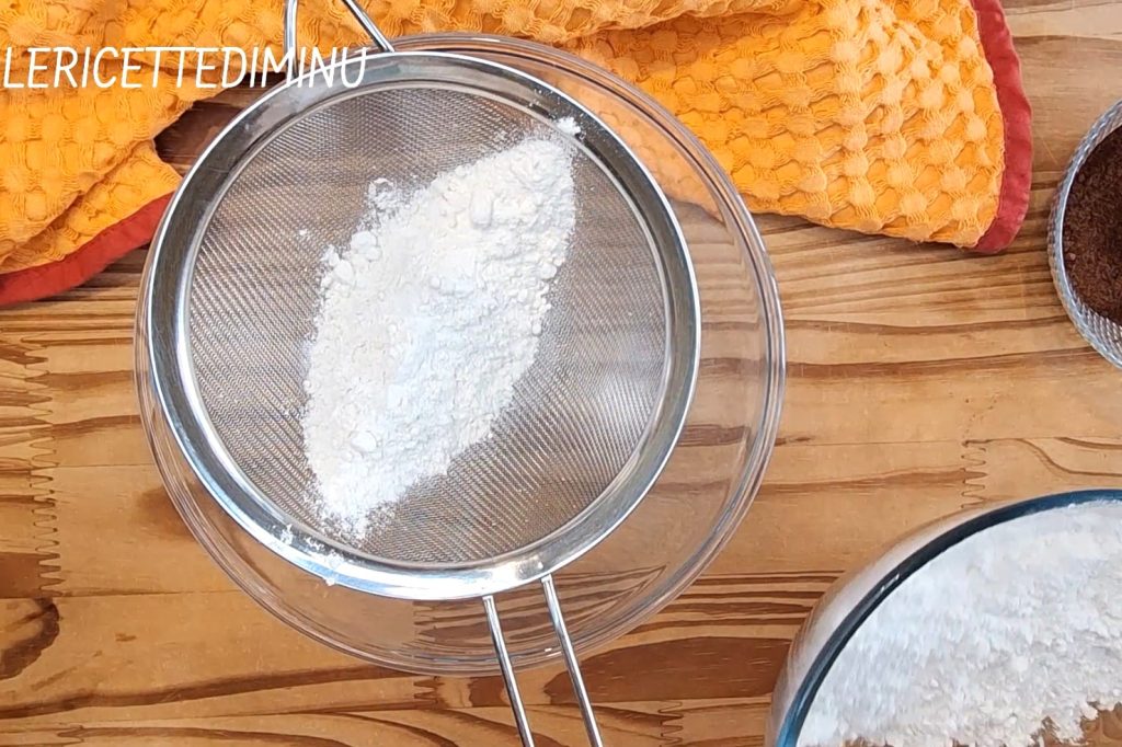 Em uma tigela, misture a farinha, o cacau e o fermento após peneirá-los.