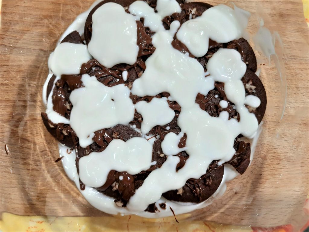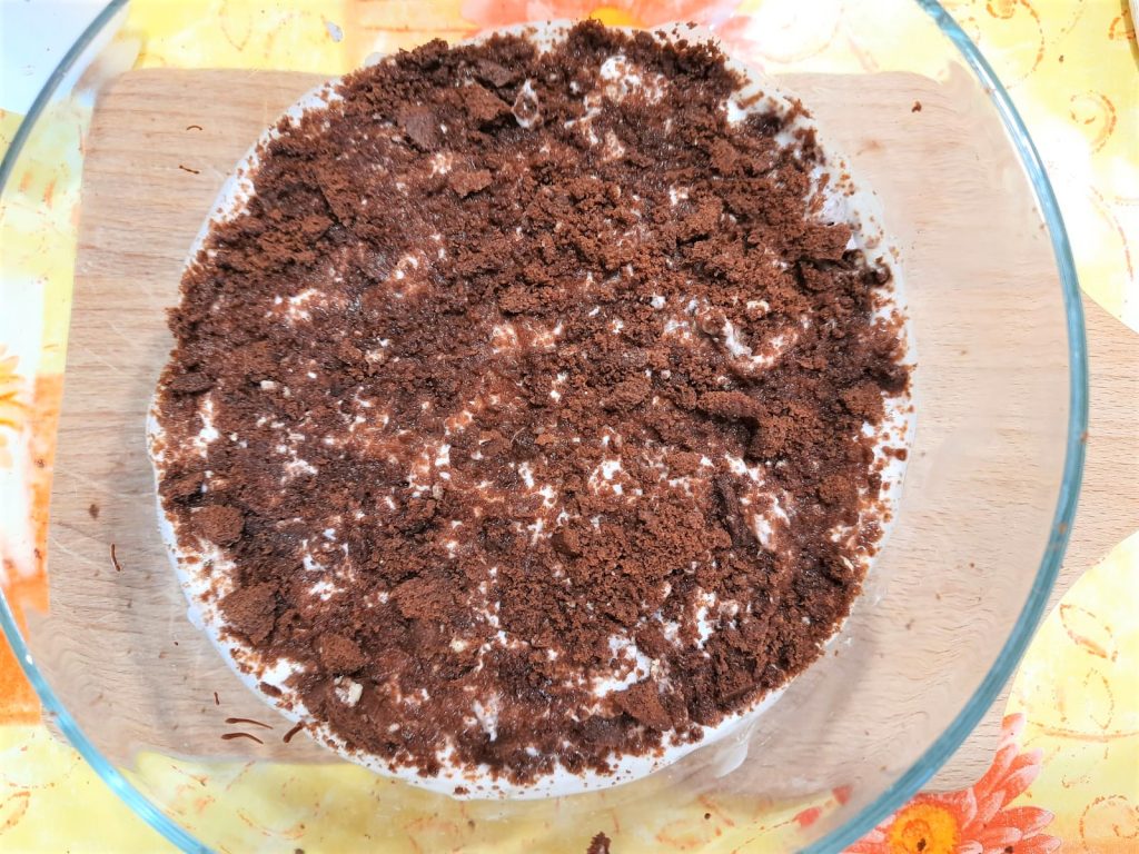 Finalize com dois ou três biscoitos esmigalhados na superfície e, se desejar, também com uma rede de chocolate derretido derramado sobre as migalhas.