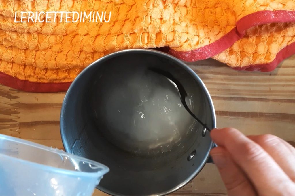 Para preparar a calda de limoncello, coloque no fogo o açúcar com a água e tiras de casca de limão não tratada.