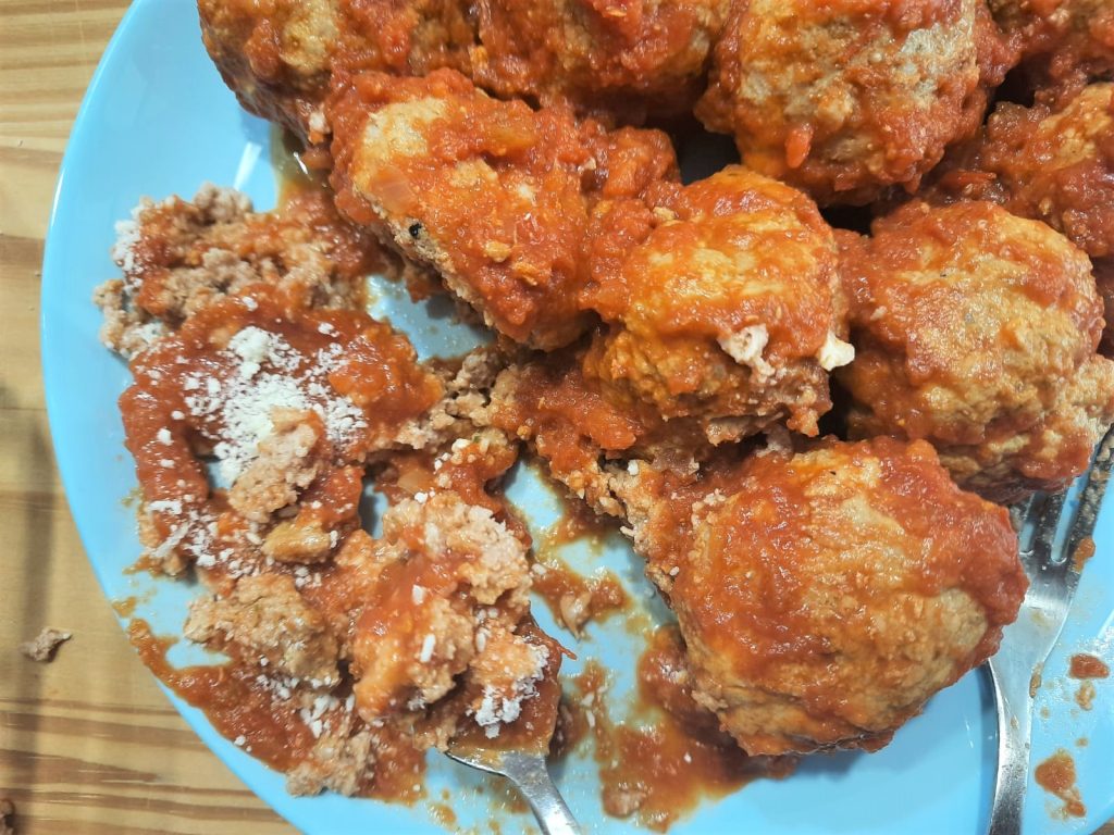 Pique as almôndegas, polvilhe-as com algumas colheres de molho e polvilhe-as com queijo parmesão ralado.