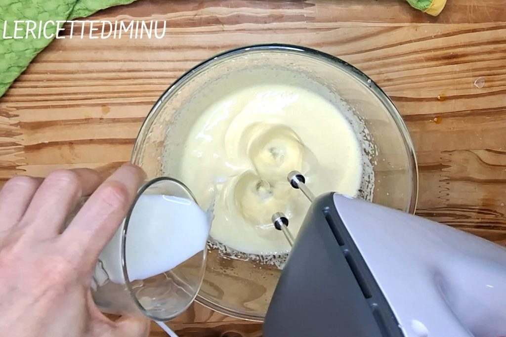 Continue até a massa ficar bem espumosa e fofa, adicione então o óleo em fio, sempre batendo a mistura, e em seguida o leite da mesma forma.